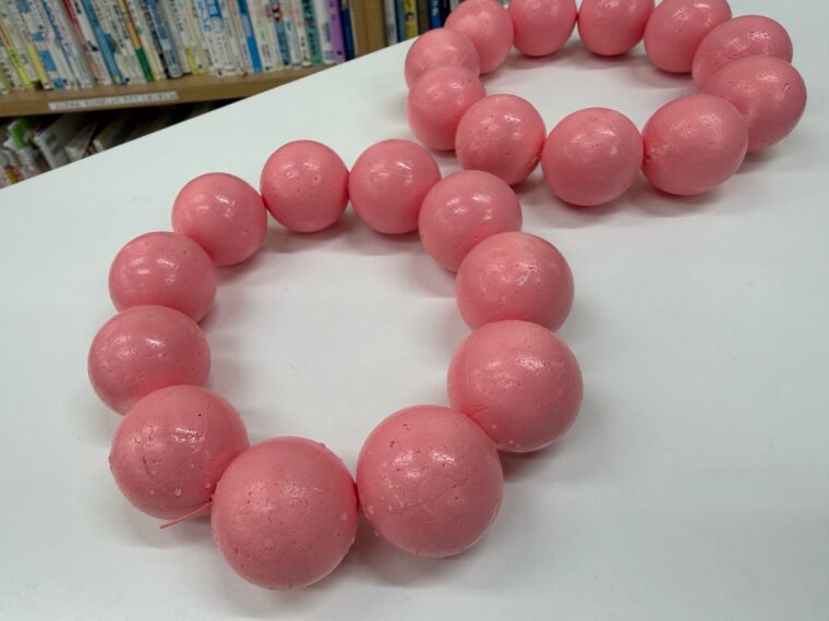 ガチャガチャのカプセルで作るには1玉がでかいし・・・。作る?そうだ、作れば良いんだ!ということで直前の買い出しにいった東急ハンズで、発泡スチロールの手頃な玉とゴム糸と塗料を買ってきて作りました。(ちひろ先生が🙇謝謝!)