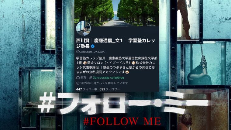 最近SNSでの居場所がすっかりXになりつつある塾長の西川です。あまり皆さんフォローはしてくださっていないかと思いますが、塾からの発信もたまに混ぜてますのでよかったらフォローお願いします。(https://x.com/courage_okazaki)